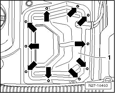 - Remove the ten bolts with multi-point socket heads - arrows - and remove the battery compartment cover - 1 -.