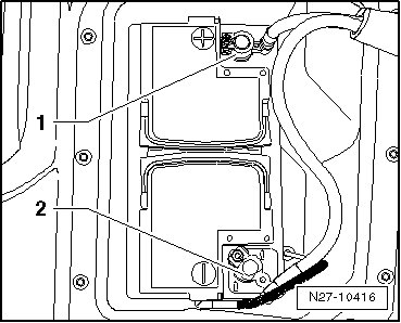 - Connect the battery clamp - 2 - to the battery negative terminal and tighten it to 6 Nm.