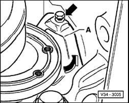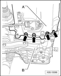 Some recesses - arrows - are located between engine - A - and transmission - B - in lower area of engine oil pan.