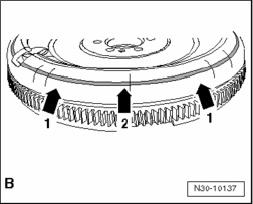 Round outer contour - arrows 1 - and a circulated depression - arrow 2 - = Clutch manufacturer, LuK = - B -