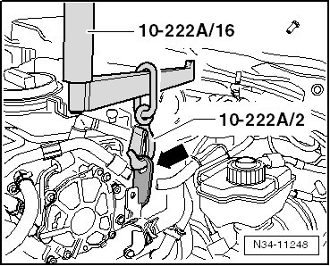 - Bring the engine/transmission assembly into a angled position by lowering it using the engine support bridge (10 - 222 A) spindles.