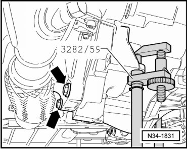 - Install the transmission support (3282) to the engine/transmission jack (V.A.G 1383A).