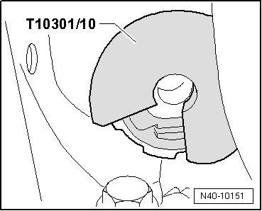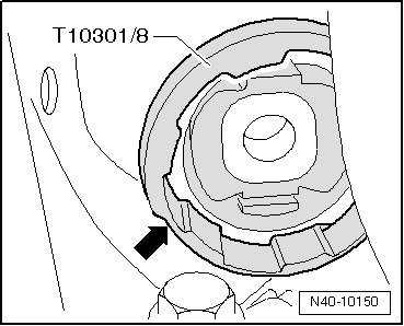 - Attach supporting ring (T10301/8) so that narrow side - arrow - faces subframe.
