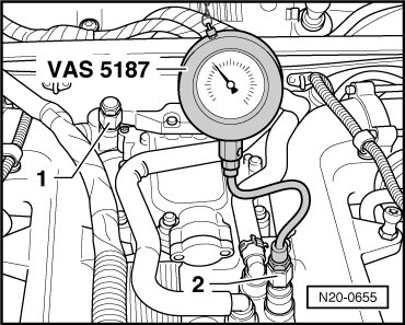 - Connect test unit for tandem pump (VAS 5187) to test connection for cylinder bank 1 - 1 - or to test connection for cylinder bank 2 - 2 -.