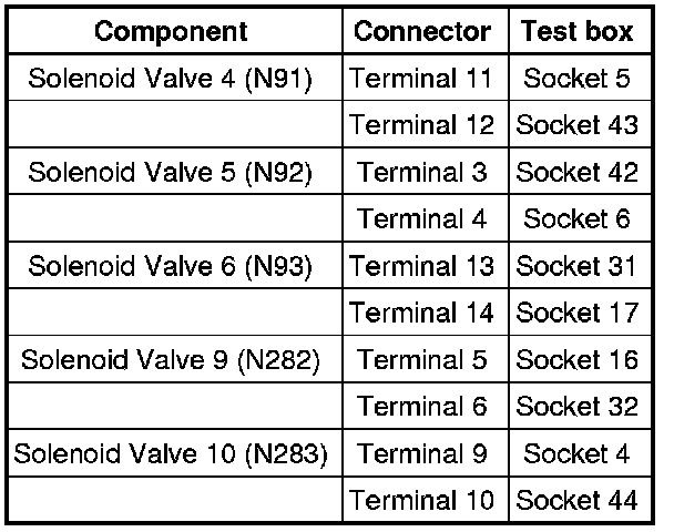 - Check resistances of solenoid valves at connector to the solenoid valves: