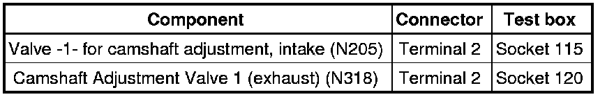 - Measure resistance between terminals of the respective valve for camshaft adjustment.
