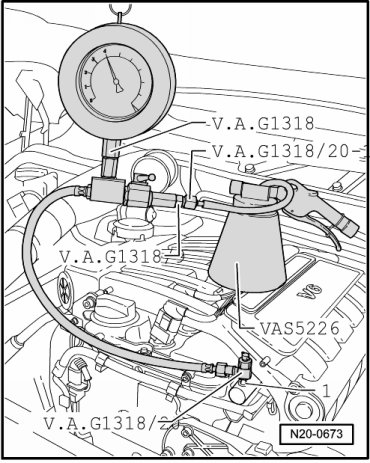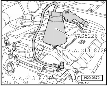 - Connect pressure tester (V.A.G 1318) to breather valve - 1 - as shown using adapter (V.A.G 1318/20), (V.A.G 1318/20-1), (V.A.G 1318/9) and diesel extractor (VAS 5226).