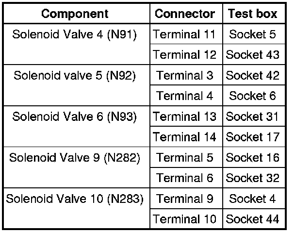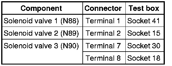 - Check resistances of solenoid valves at connector to the solenoid valves: