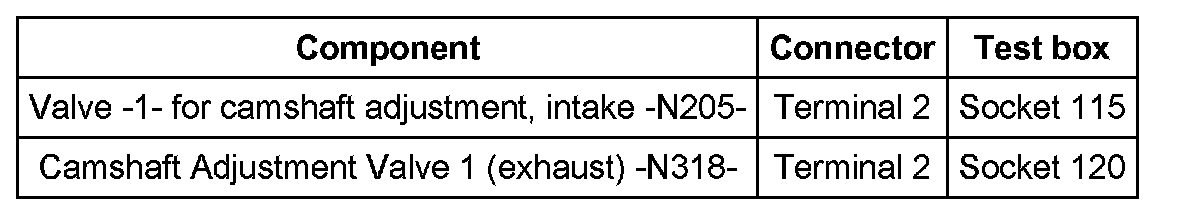 - Measure resistance between terminals of the respective valve for camshaft adjustment.