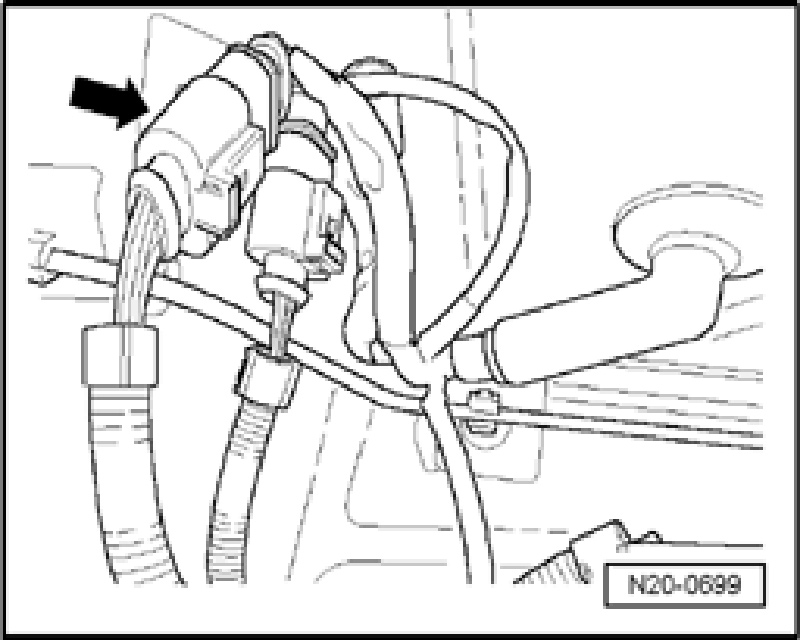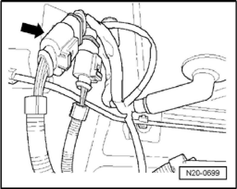 - Connect V.A.G 1348/3A remote control with adapter V.A.G 1348/3-3 to connector (arrow) of Fuel Pump (FP) relay for right Fuel Pump (FP).