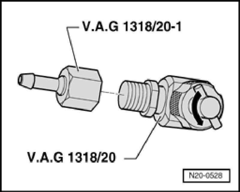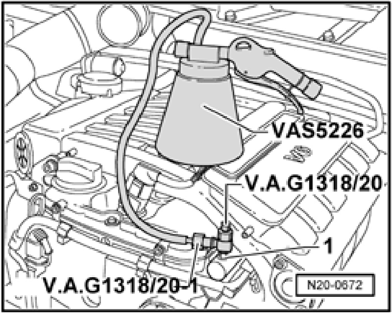 - Connect adapter (V.A.G 1318/20) with adapter (V.A.G 1318/20-1) and diesel extractor (VAS 5226) to bleeder valve -1-.