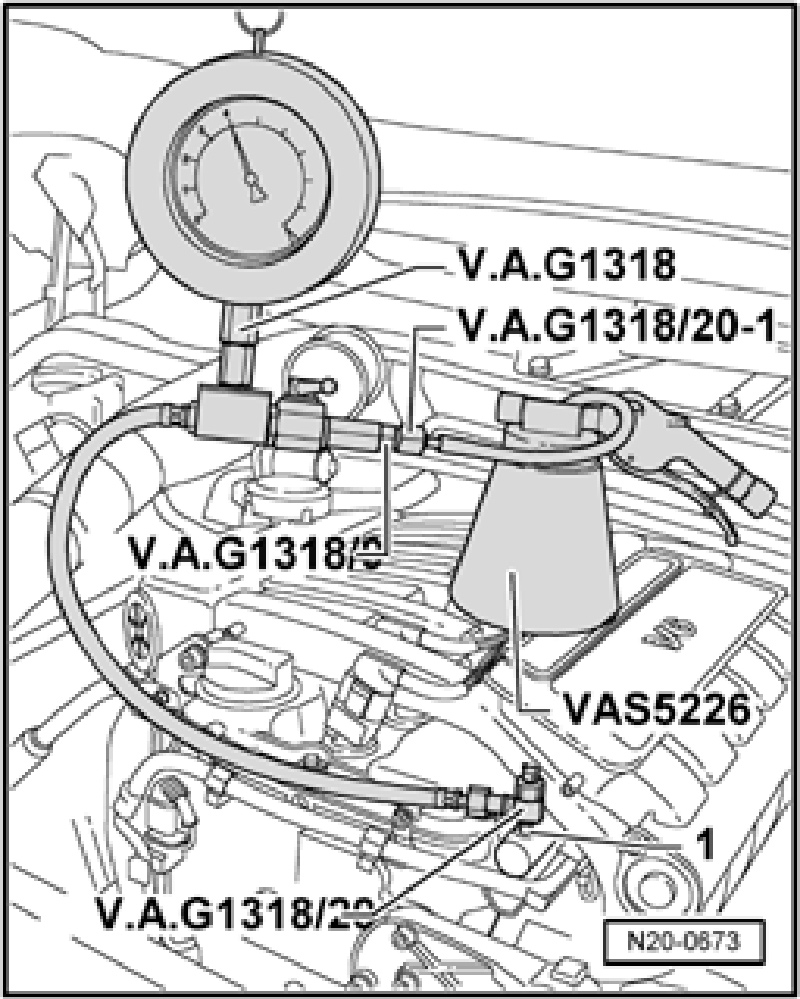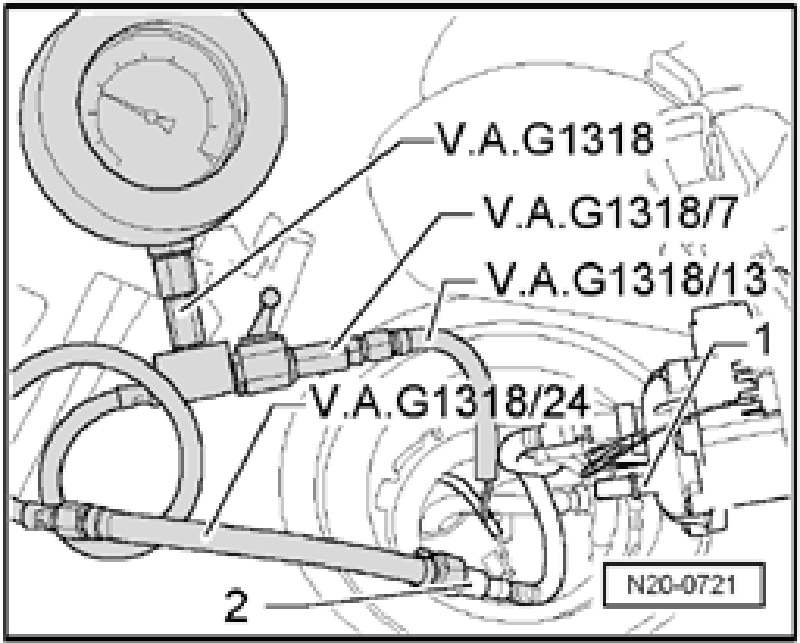 - Now, connect pressure gauge (V.A.G 1318) with adapters (V.A.G 1318/20, V.A.G 1318/20-1, V.A.G 1318/9) and diesel extractor (VAS 5226) as shown to bleeder valve - 1-.