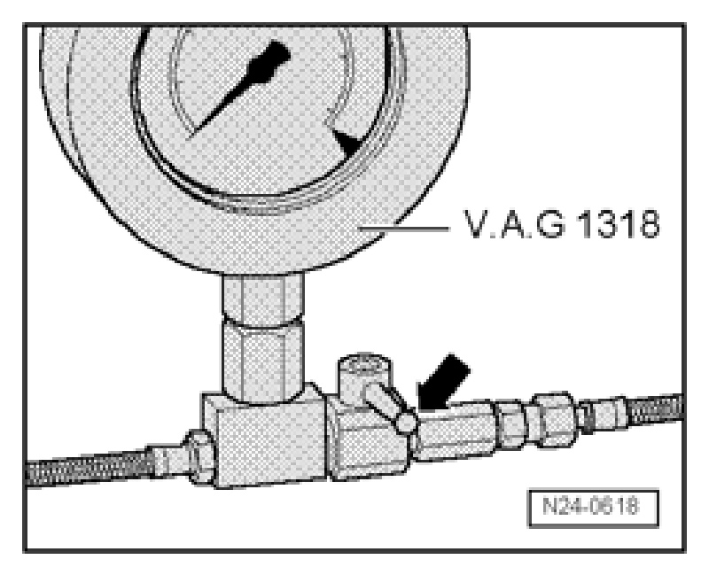 - Open shut-off valve of pressure gauge and let fuel flow back into fuel tank via V.A.G 1318/13 hose adapter.