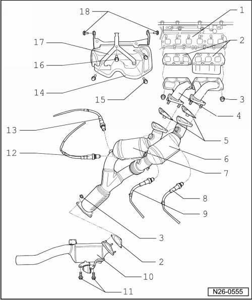 • When installing exhaust pipes, ensure that the flange connection after the catalytic converter seals tightly. Leaks in this area produce pulsations in the exhaust. This allows ambient air to reach the lambda probe after catalytic converter and the lambda regulation will be disturbed.