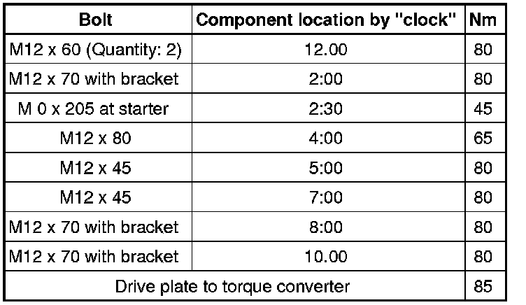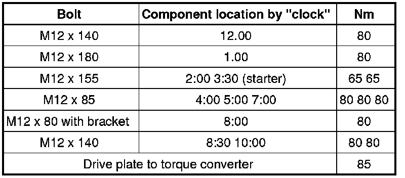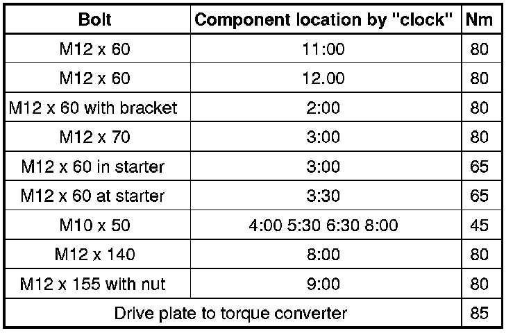 Drive plate to torque converter, quantity: 6 = 85 Nm.