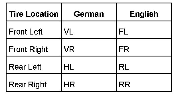 In the following Fields with "On-vehicle wheel locations" might be displayed in German or English. Refer to table above for German / English translation.