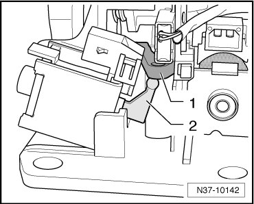 - Make sure that the solenoid is locked in its mount - arrow - up to the limit stop and the lever - 2 - engages the locking lever - 1 -.