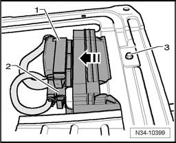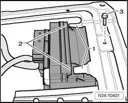 - Press retaining tabs - 1 - in direction of - arrow - and pull differential control module J646 out of retainer. Make sure that the differential control module J646 does not fall to floor.