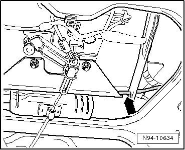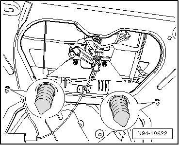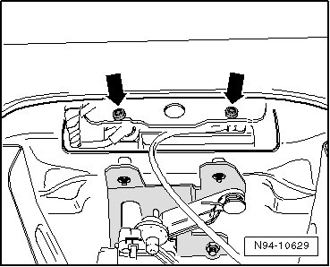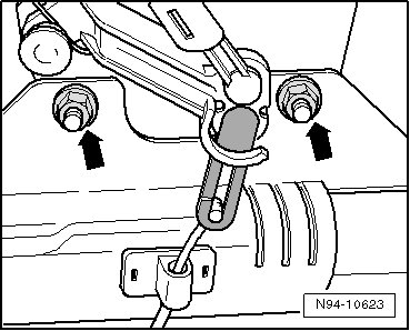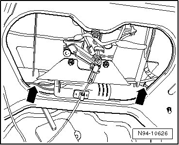 - Remove both nuts on bracket for emergency release cable - arrows -.