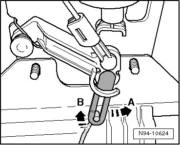 - Remove emergency release cable by moving gray plastic bracket in direction - A - and simultaneously moving emergency release cable in direction - B - until both parts unhook from lock linkage and can be removed.