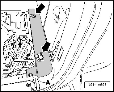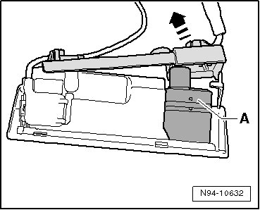 - Remove retaining bracket in - direction of arrow - and pull rear view camera - A - out of holder.