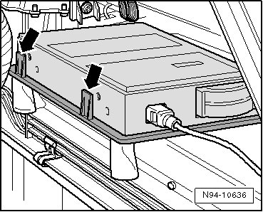- Press both locking mechanisms - arrows - and remove control module for rear view camera system.