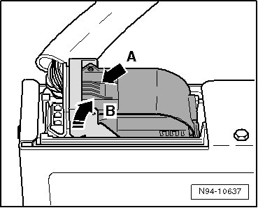 - Press locking mechanism - A - and fold over the bracket in direction - B -. Then disconnect harness connector from control module.