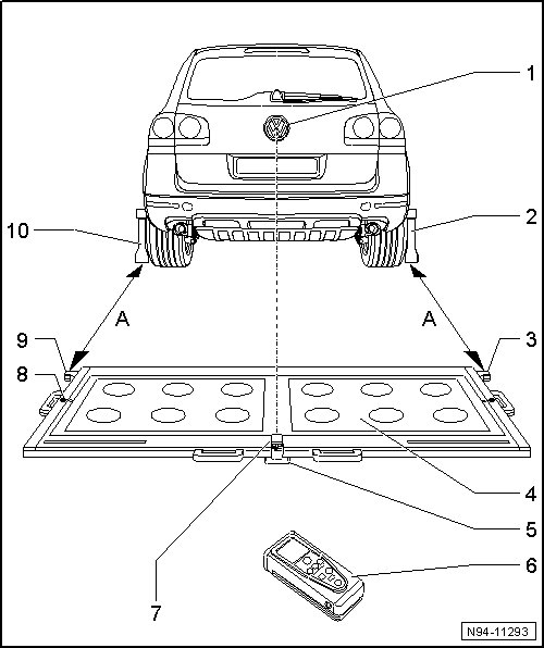 - Position the calibration device (VAS 6350/4) behind the vehicle with a distance of 1.2 m to 1.7 m between the angled brackets on the calibration device and the paddles at the rear wheel center wheel mounts as shown in the overview illustration - dimension A - --> [ (Item 4) ].