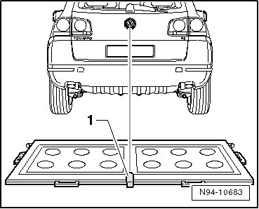 - Switch on the laser on the calibration device - 1 - and align the entire calibration device so that laser beam strikes on center of vehicle rear end above the VW logo.