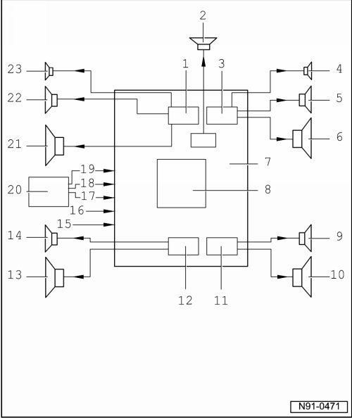 7 - Complete amplifier, terminal assignment on " Sound 1" system, refer to --> [ Multi-pin Connector A, 24-pin on System ] Connectors on "Sound 1" and "Sound 2" System and terminal assignment on "Sound 2" system, --> [ Multi-pin Connector A, 24-pin on System ] Connectors on "Sound 1" and "Sound 2" System