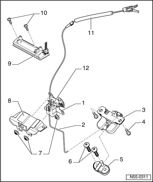 • With actuator lever for emergency release lever and Rear Lid Unlock Motor -V139-.