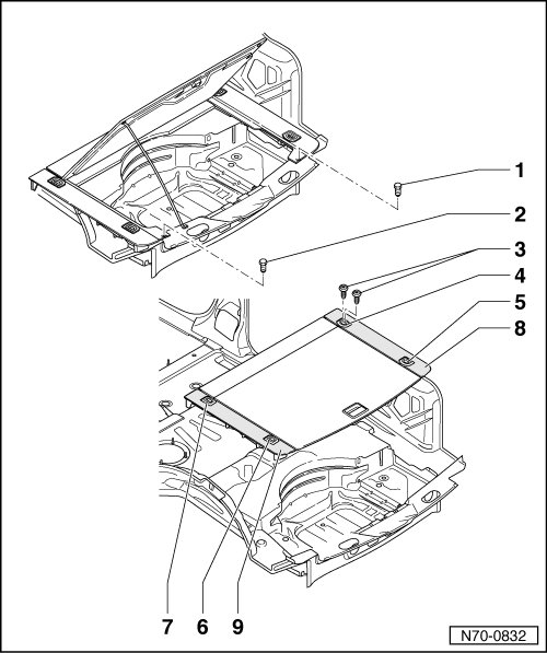 - Remove spare wheel cover, right cover support - 8 - and left cover support - 9 - from vehicle.