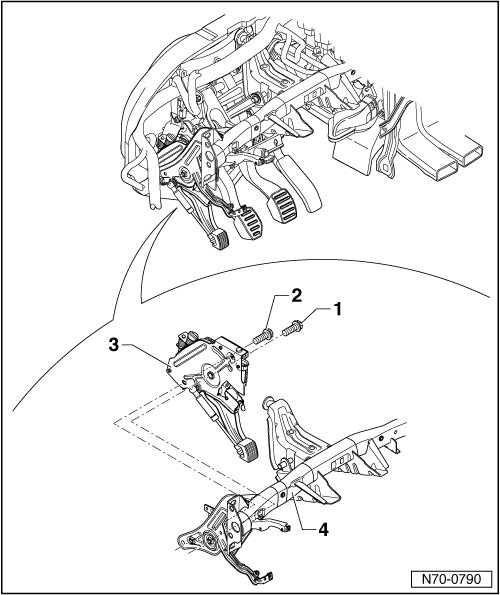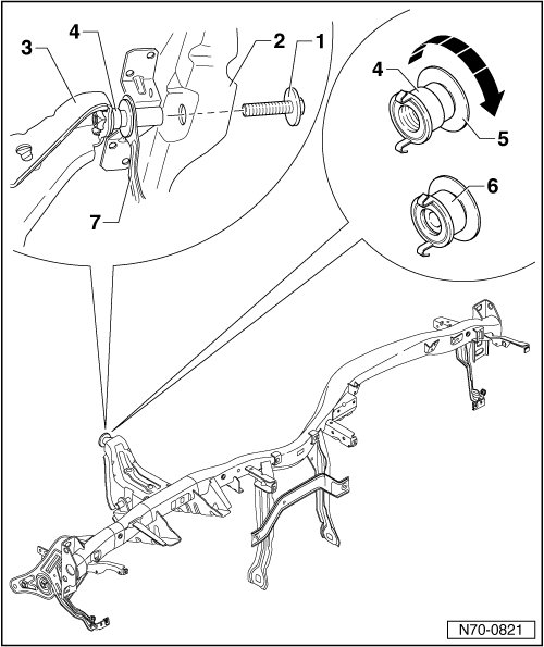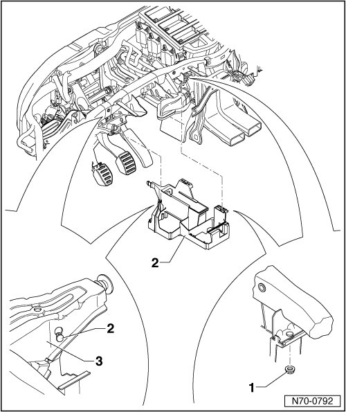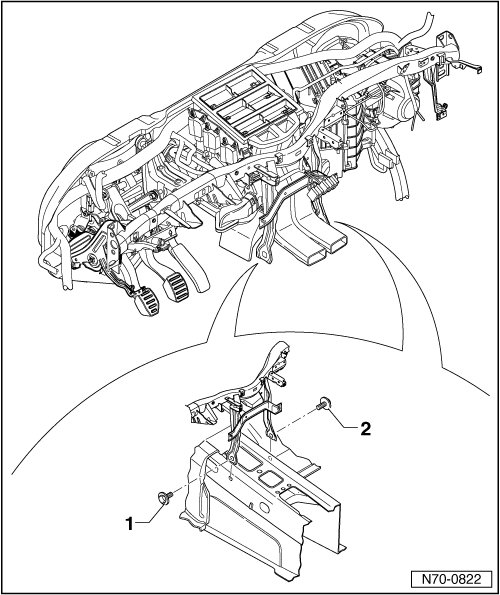 • The assembly carrier is secured with a bolt - 1 - on the bulkhead - 2 -. The position of the bolt is above the steering column. The bolt is accessible from the plenum chamber.