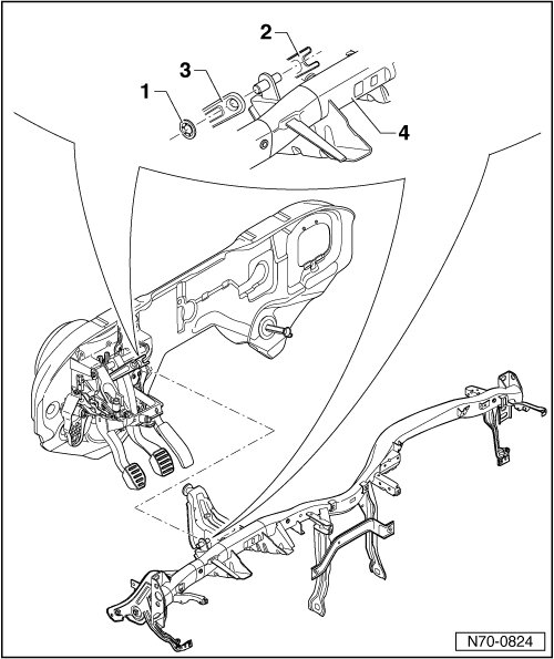 - Pull crash bars - 2 - and - 3 - for foot pedal cluster down from mounting pins on assembly carrier - 4 -.