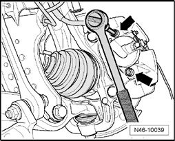 - Remove both guide pins - arrows - from the brake caliper.