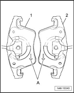When installed, arrow - A - on the backing plate of brake pad must face downward.