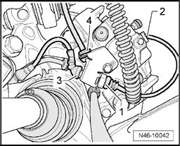 - Remove bottom of connector - 3 - of brake pad wear indicator and wheel speed sensor wire - 4 - from brake caliper bracket.