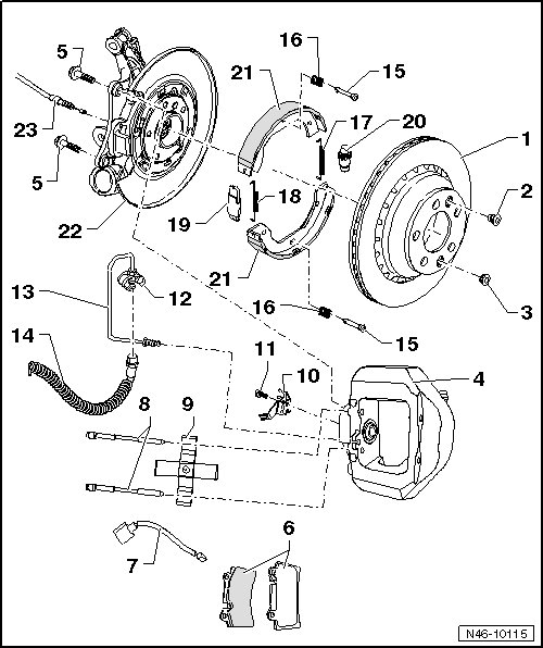 • Before removing brake caliper or disconnecting brake line, brake pedal actuator (VAG 1869/2) must be inserted (this dissipates pressure).