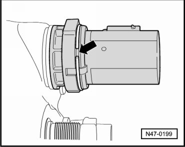 - Pry circlip out of groove - arrow - and remove brake booster membrane position sensor from brake booster.