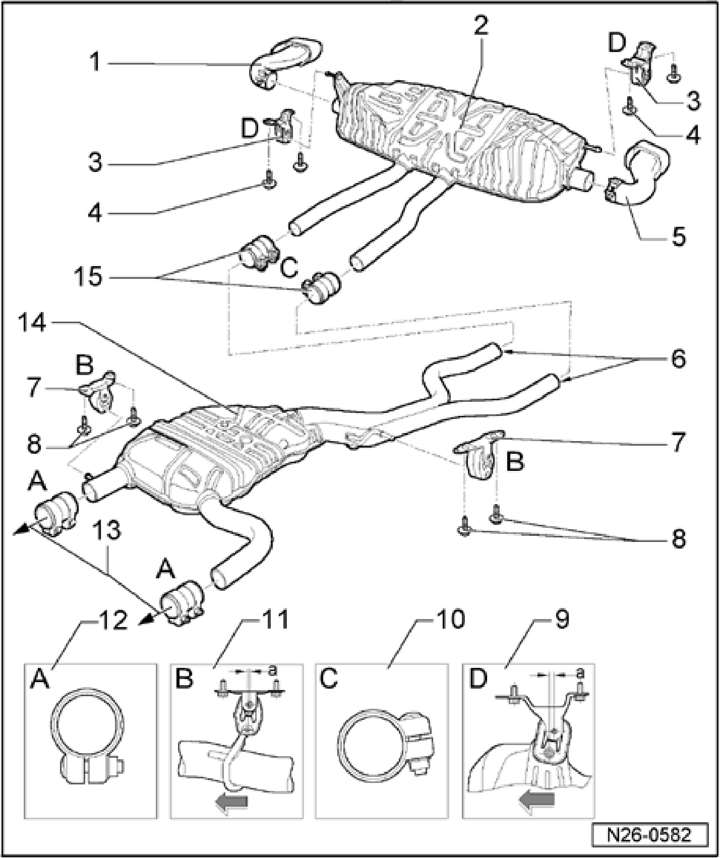 - At factory, center and rear mufflers are installed as a single component. Spare center and rear mufflers are supplied separately for the case of repairs, with double clamps for the connection.