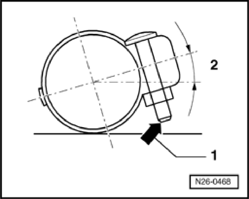 - Press exhaust system in direction of travel (arrow - 1-) and tighten double clamps tightly until dimension - a- at suspensions is reached.
