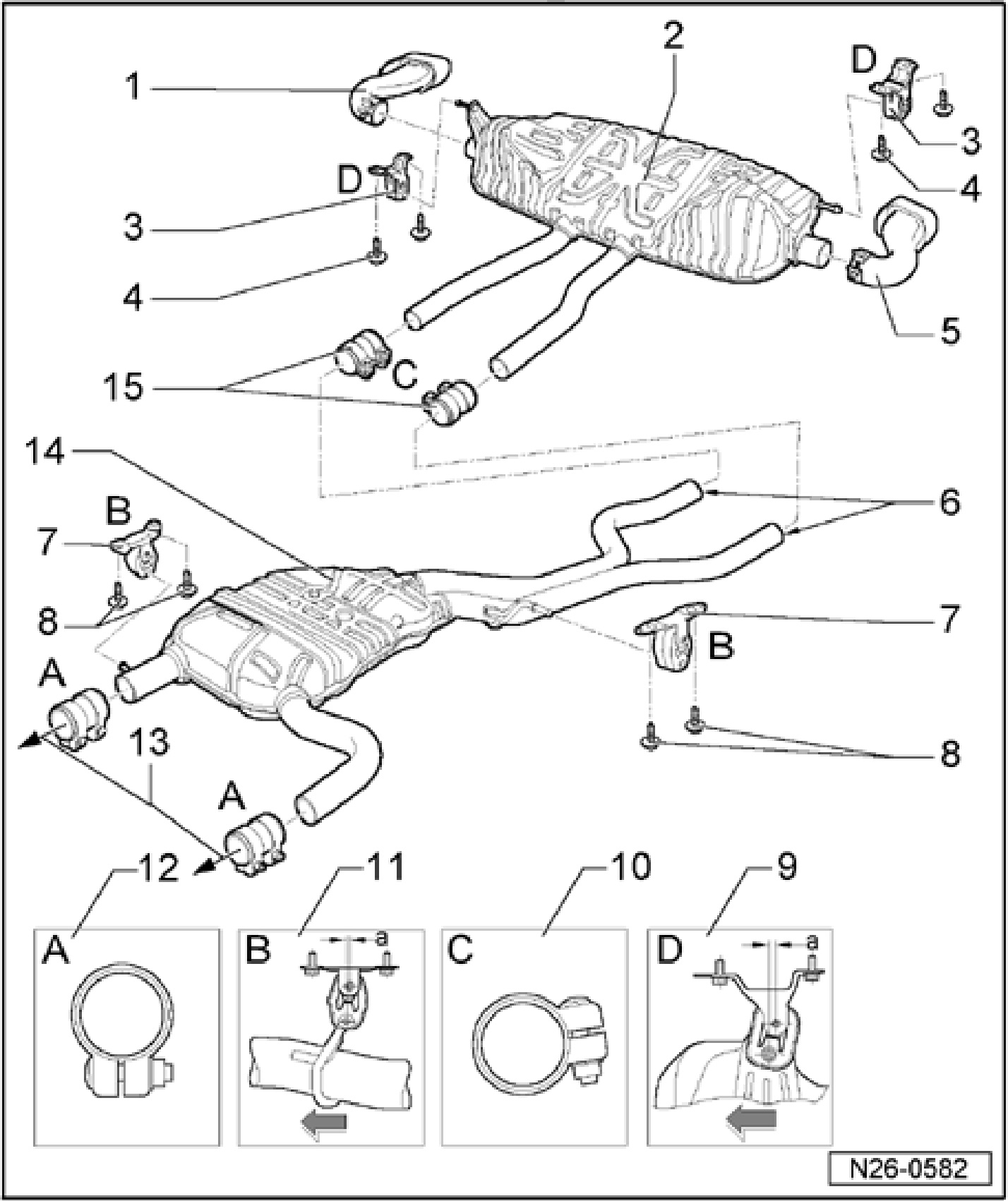 - Identified on exhaust pipe by an impression As standard, center and rear mufflers are installed as a single component. If repairs are necessary, the center and rear mufflers are supplied individually and include a double clamp for connecting.