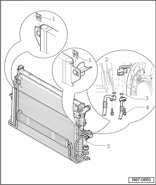 - Loosen the refrigerant lines at the bolts - 4 -.