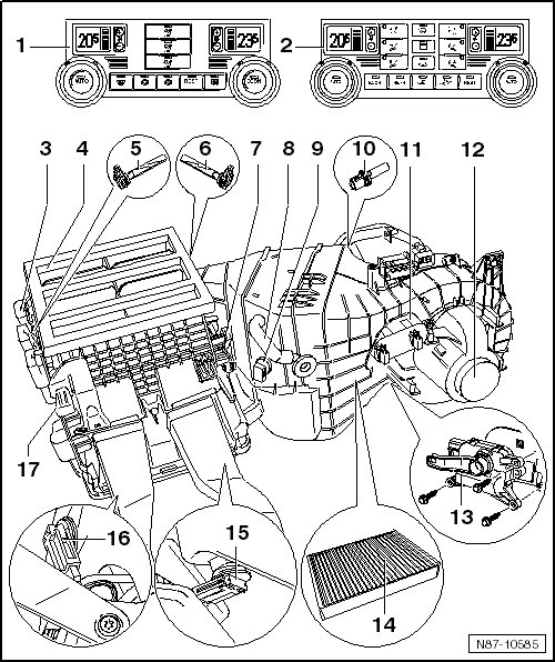 • Removing and installing, refer to --> [ Dust and Pollen Filter with Activated Charcoal Filter Insert ] Service and Repair