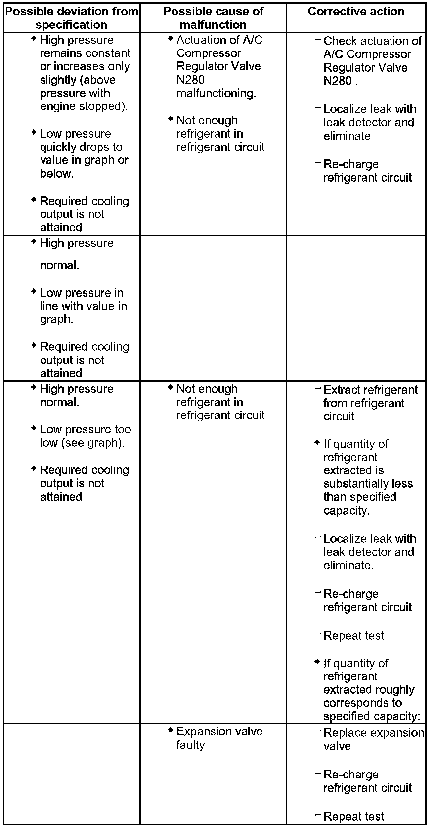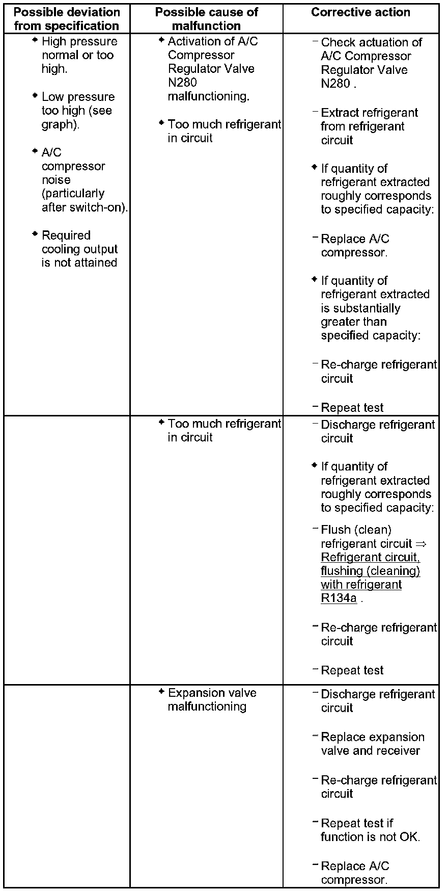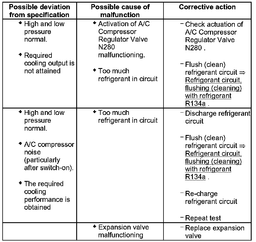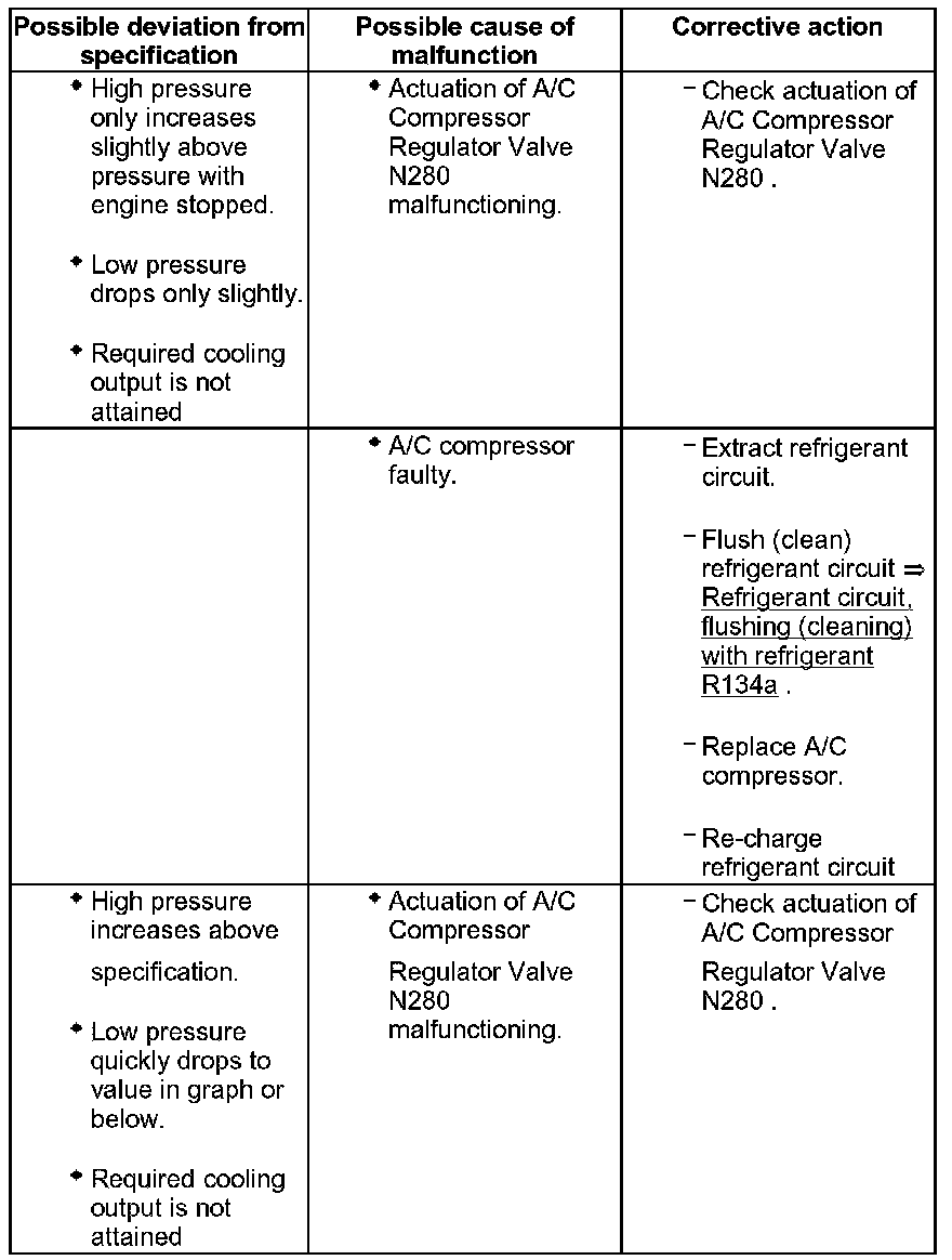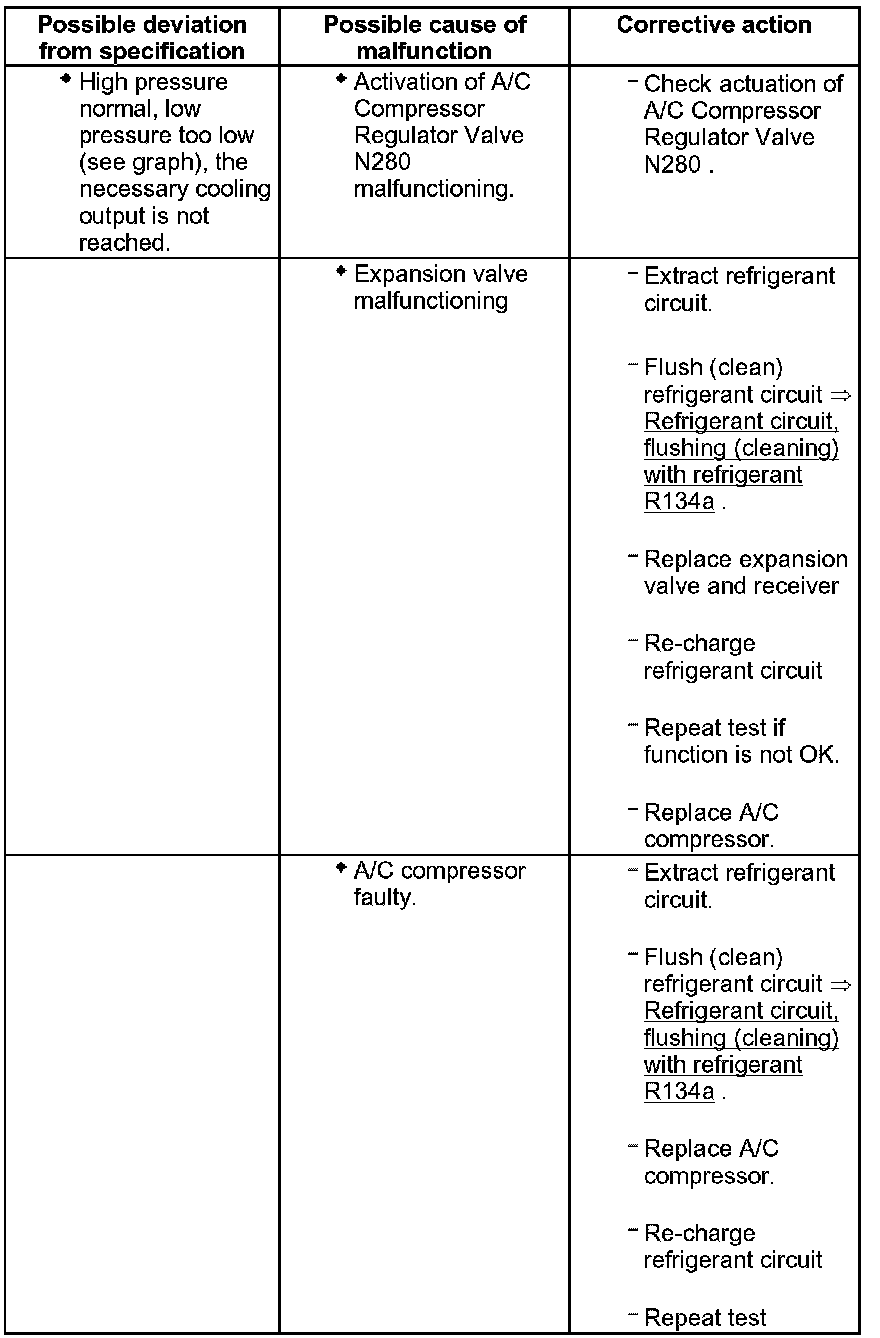 - If expansion valve is malfunctioning (permanently closed or does not open sufficiently), A/C Compressor Regulator Valve N280 is actuated to maximum output and low pressure drops to value in graph or below (compressor draws off refrigerant from low-pressure side). As however refrigerant cannot flow via expansion valve, cooling output is not attained and high pressure may also not increase or only increase slightly due to the absence of energy conversion.
