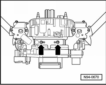 - Remove both bolts - arrows - at bridge of Steering Wheel Tiptronic Switch (E389).