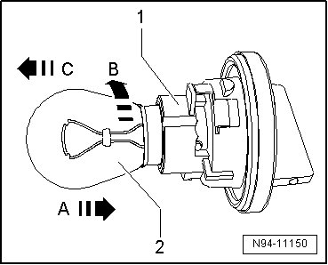 • Rotate the grip piece with the bulb socket - 1 - together with the front turn signal lamp in the - direction of arrow - and remove it from the headlamp housing.