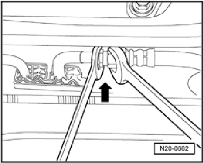 - Place a rag around threaded connection - arrow - and relieve fuel pressure by briefly opening the line.