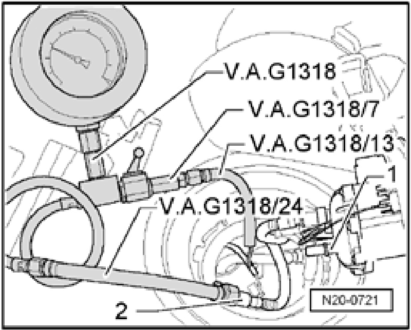 - Connect pressure tester V.A.G 1318 with adapter V.A.G 1318/7, adapter V.A.G 1318/13 and adapter V.A.G 1318/24 as shown.