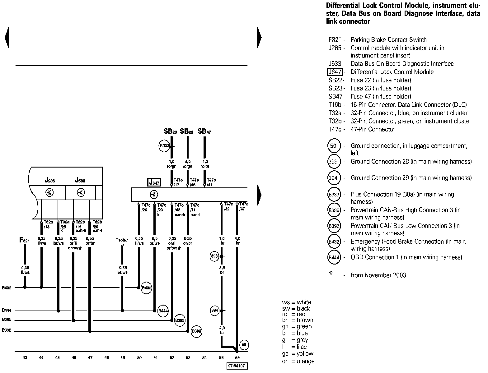 Fuse Identification: Starting with fuse 23, fuses in the fuse holder are identified with an additional numeral 2 added to the number when shown in the wiring diagram (i.e. fuse 23 in the vehicle becomes 223 in the diagrams, fuse 24 becomes 224, and so on).